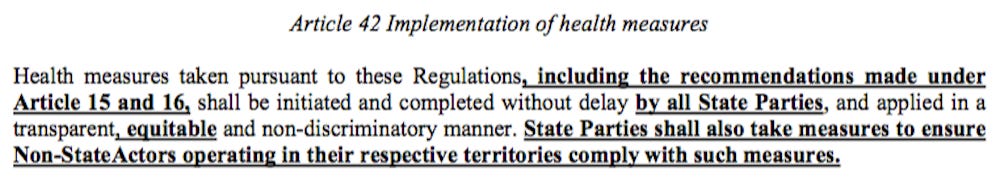 The existing Article 18 lists a number of "recommendations" that the WHO could make but, if the proposed amendments are adopted, these non-binding recommendations would no longer merely be suggestions, but would be legally-binding upon the member nations. (Page 16)